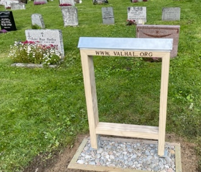 Bilde: Gravstøtta er laget av Kurt Feinschnecker av acetylert furu (50 års garanti), taket i sink av Frode Jenderå, blikkenslagermester, V & H sitt barnebarn. Lars Stian Fagerlid Valdermo (oldebarn) er dataansvarlig. Det hele er organisert av Odd Valdermo. Oppdatert 24.10.22.